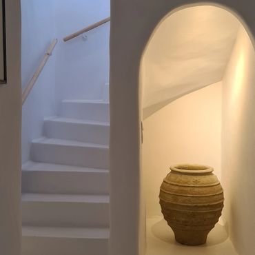 Ο εσωτερικός σχεδιασμός, η χρήση φυσικών υλικών, η τεχνική της τσιμετοκονίας και το φυσικό φως, δημιουργούν μια χαλαρωτική ατμόσφαιρα.