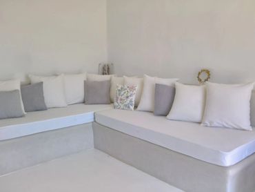 Κατά την είσοδο υπάρχει ένα μεγάλο σαλόνι με άνετο χτιστό καναπέ - με την παραδοσιακή τεχνική της τσιμεντοκονίας – όπου μπορούν να κοιμηθούν 2 ενηλικές ή παιδιά, καθώς οι διαστάσεις των στρωμάτων είναι κανονικών κρεβατιών.